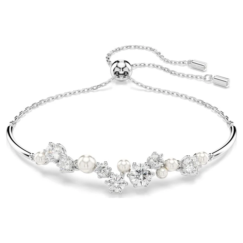 Embrace the infinite magic of the stars with this glittering Constella bangle. The inspired design features a delicate chain and a cluster of different-sized Swarovski Zirconia and Swarovski Crystal Pearls, which appear to float among the jewelry’s metallic bars. A pulling mechanism closure also enhances the fit, making it perfect for any wrist. Style this with other pieces of Constella jewelry for a glowing ode to the night sky.